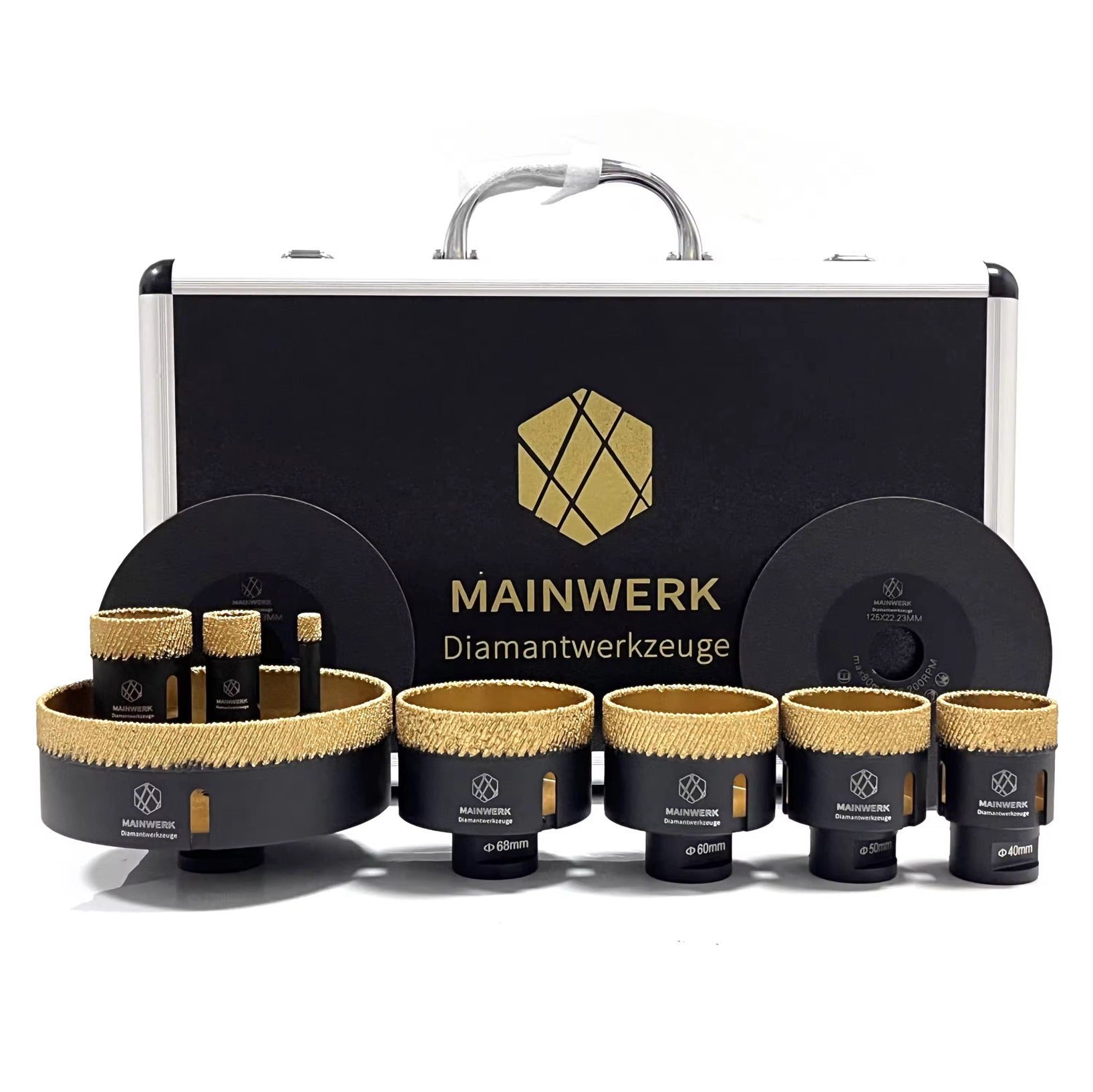 Die Mainwerk Matrix Pro Gold Edition ist das ideale Kofferset für Handwerker und Profis. Mit der fortschrittlichen Matrix Technologie bieten die Diamantbohrkronen eine längere Standzeit, eine bessere Kühlung und eine gleichbleibende Bohrleistung im Vergleich zu anderen Produkten. Perfekt zum schnellen und sauberen Bohren von Fliesen, Naturstein und Granit. Enthält außerdem 2 Diamanttrennscheiben für perfekte Schnitte.