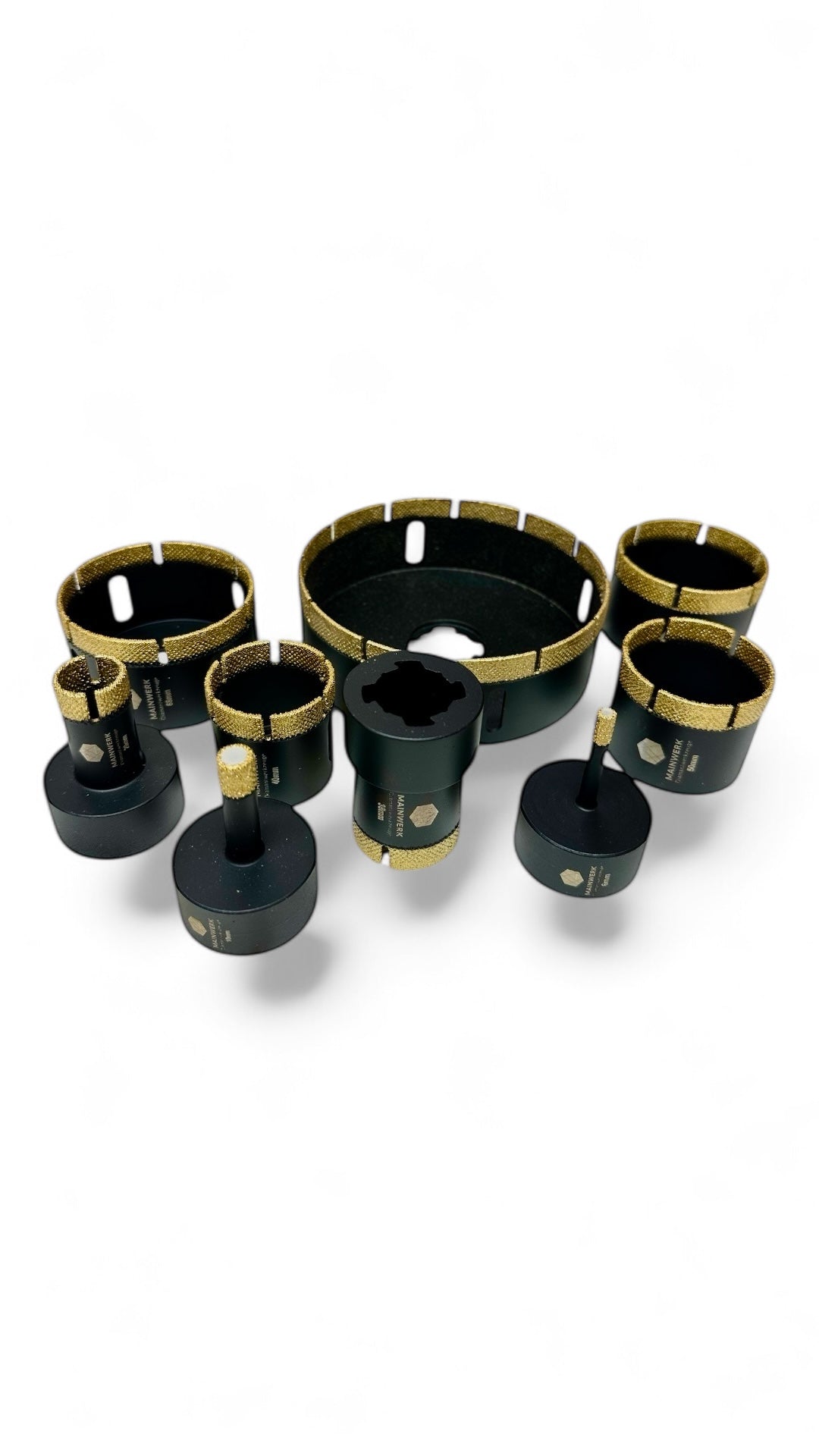 Unsere Matrix Bohrkronen sind mit homogen angeordneten und gelöteten Diamantschleifkörnern angefertigt. Unser Produkt sorgt aufgrund der schräg angeordneten Diamanten für eine präzise Bohrung und ist perfekt geeignet für harte Materialien. Die erstklassige Kühlung erhöht die Lebensdauer der Bohrkronen.